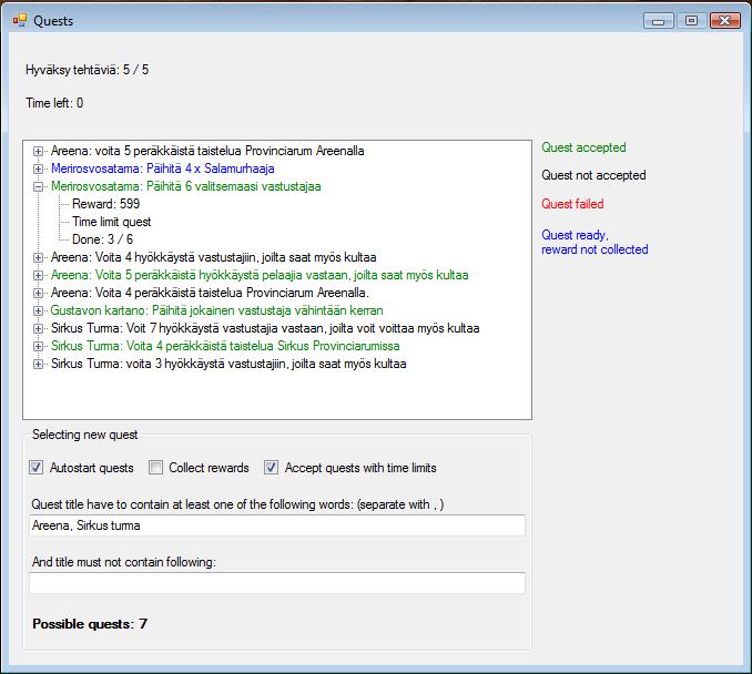 Bot update under work. Some servers has problems with dungeons and those will be fixed. Also you dont need language settings for dungeons anymore. New function, quests, will be added. Bot starts quests and collects rewards. To get this working 100% I need you to post all problems to forum and also you can suggest how to improve it :) At the moment most work is done and its under testing in 3 servers. I will release update in this week. | |